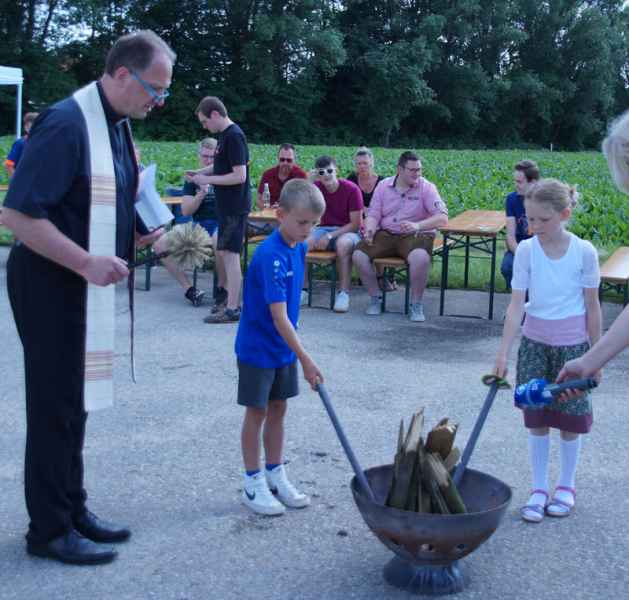 Aber auch das wäre dem Verein, bei dem auch die christlichen Werte im Vordergrund stehen zu wenig gewesen und so hielt man statt eines Gottesdienstes eine Andacht, den Pfarrer Stefan Wissel zelebrierte. Bei den Fürbitten, die KLJB-Vorsitzender Philipp Seitz vortrug, betete man vor allem für die jüngsten Terroropfer, der Kriegsopfer und derer die Hungerleiden und bat um Frieden, Gerechtigkeit und Bewahrung der Schöpfung. Im Anschluss durften zwei Kinder das Feuer entzünden durften.