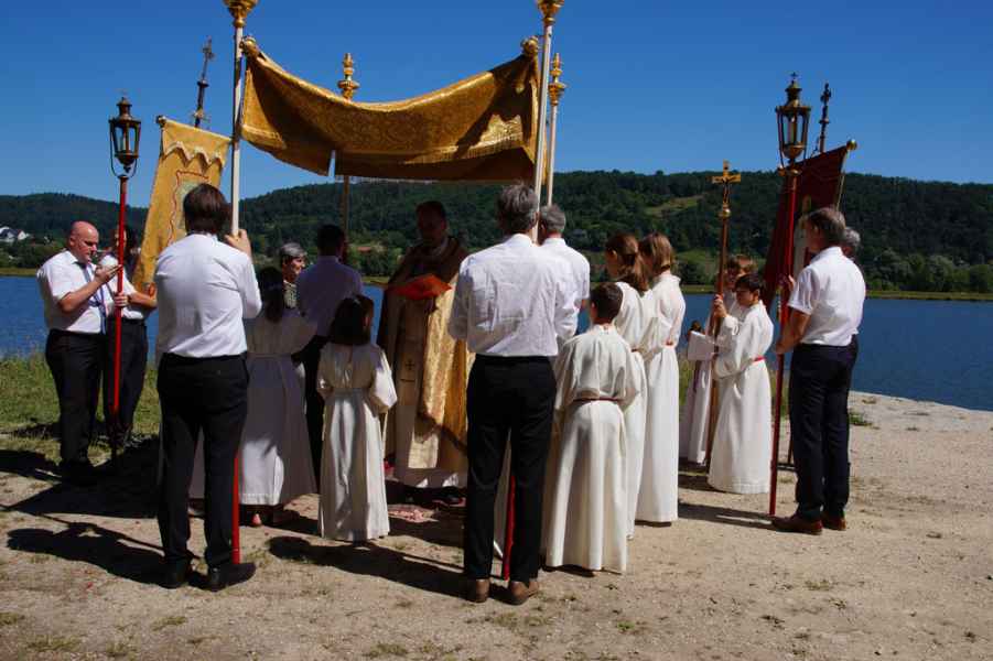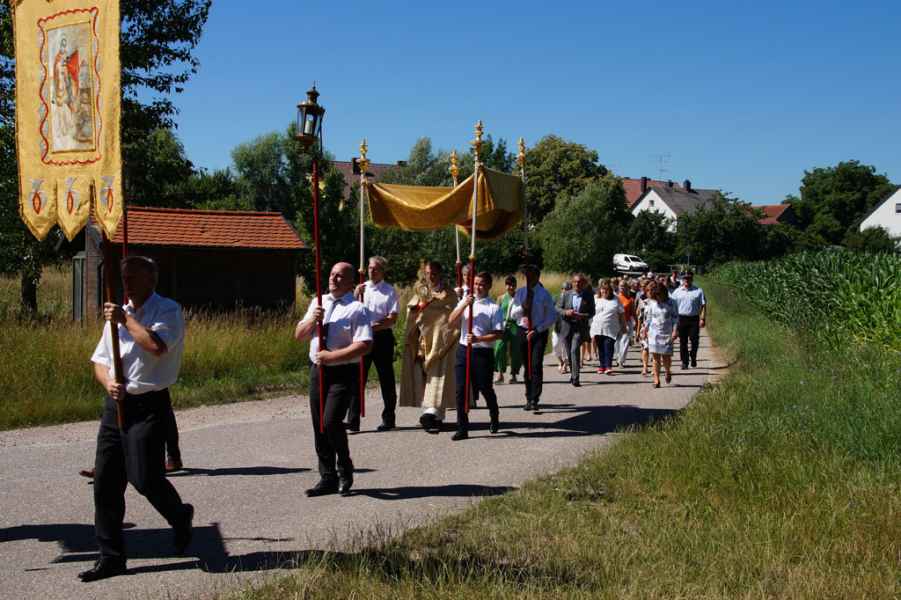 Den feierlichen Gottesdienst, der von zahlreichen Gläubigen darunter auch Fahnenabordnungen der Vereine der Orte Friesheim, Illkofen, Auburg/Altach und Eltheim und die Erstkommunionkinder besucht wurde, zelebrierte Pfarrer Stefan Wissel. Im Anschluss des feierlichen Gottesdienstes, bei dem sich die Fahnenträger mit ihren Bannern um den Altar aufgestellt hatten, ging es in Prozessionsordnung betend und singend und begleitet von einer Blaskapelle zum Donaudamm, wo eigens ein Altar aufgebaut war.