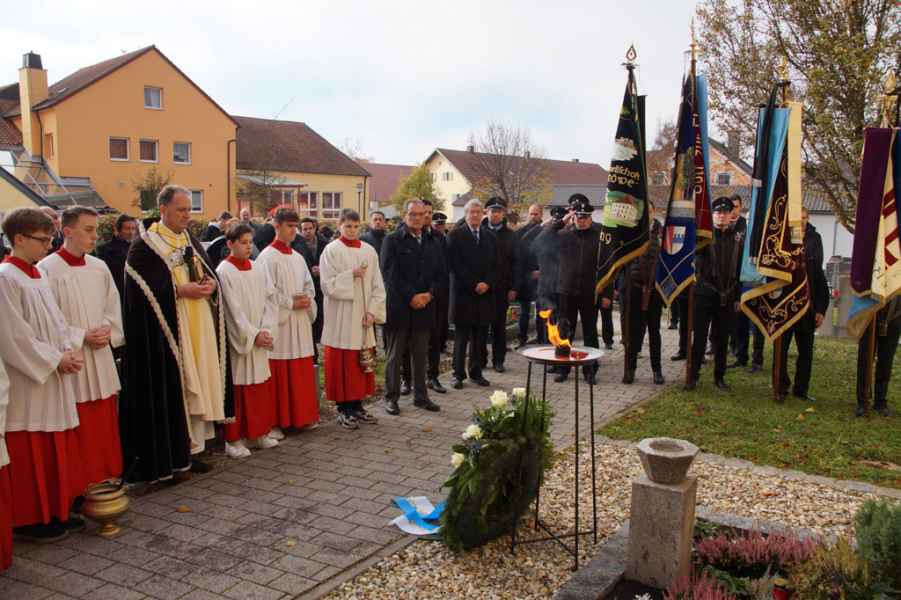 Dieser Tag soll Erinnerung und symbolische Mahnung zum Frieden zugleich sein. Im Bewusstsein der Bedeutung dieses Tages waren alle Ortsvereine durch Fahnen- und Mitgliedsabordnungen sowie zahlreiche Bürgerinnen und Bürger gekommen, um zur würdigen Umrahmung der Gedenkfeier beizutragen. Den vorangegangenen Gedenkgottesdienst in der Pfarrkirche St. Martin zelebrierte Pfarrer Stefan Wissel, in dessen Anschluss die Gedenkfeier beim Kriegerdenkmal am Friedhof stattfand, wo sich bereits Soldaten und Reservisten zur Ehrenwache postiert hatten. Nach einem Totengedenken durch den Geistlichen erinnerte, Bürgermeister Hans Thiel, dass man den Gefallenen und Getöteten der Kriege und des Terrors gedenke.