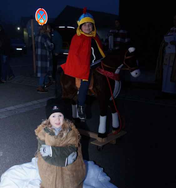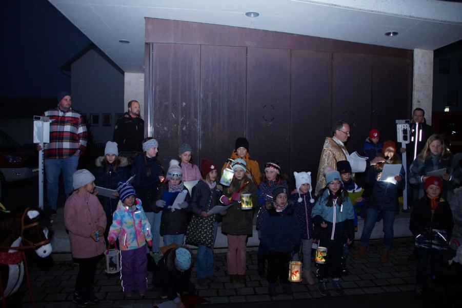 Ohne zu zögern teilt er mit dem Schwert seinen Mantel und überreicht dem Bettler die Hälfte. Gebannt lauschten die Kindergarten- und Krippenkinder dem Schauspiel und sangen begeistert bei dem Lied „Lichterkinder“ mit, ehe sie sich nach der Segnung von Pfarrer Wissen auf den Weg mit ihren Laternen machten und unterwegs die bekannten Martinslieder sangen. Der Martinszug endete anschließend im Hof von Mesner Martin Kellnhauser, wo ein kleines Martinsfest stattfand, mit Martinsgänsen, Knackersemmeln und Glühwein oder Kinderpunsch.