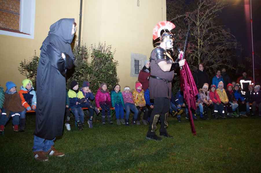 Das inszenierte Martinsspiel erinnerte an den Heiligen Martin, der mit anderen Soldaten vor den Toren der Stadt auf einen armen, frierenden Bettler traf. Martin teilte seinen warmen Mantel mit dem Schwert und gab die eine Hälfte dem armen Mann und gestalteten die Martinsgeschichte für die vielen Kinder noch einmal erlebbar nach, ebenso wie Martins weiteres Leben, als ihm im Traum Jesus erschien und er später zum Bischof geweiht wurde. Pfarrer Stefan Wissel, hob in der Wortandacht hervor, dass Menschen ein Licht anzünden im Dunkel, warum dies so sei, erzähle auch die Geschichte des Heiligen Martins, denn wenn Menschen teilen, werde es nicht nur in den Laternen, sondern auch in den Herzen der Menschen hell. „Jeder kann werden wie Martin, denn jeder kann teilen“, so das Motto der Andacht.