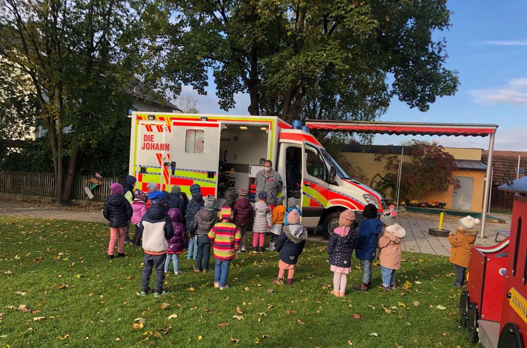 Die Johanniter waren mit dem Rettungswagen zu Besuch im Kindergarten und Krippe