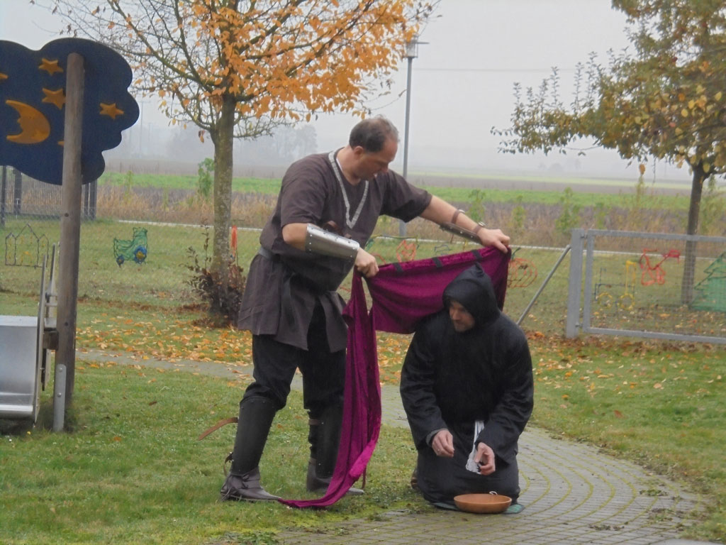 Pfarrer und Vizebürgermeister spielen St. Martin und Bettler für die Kinder